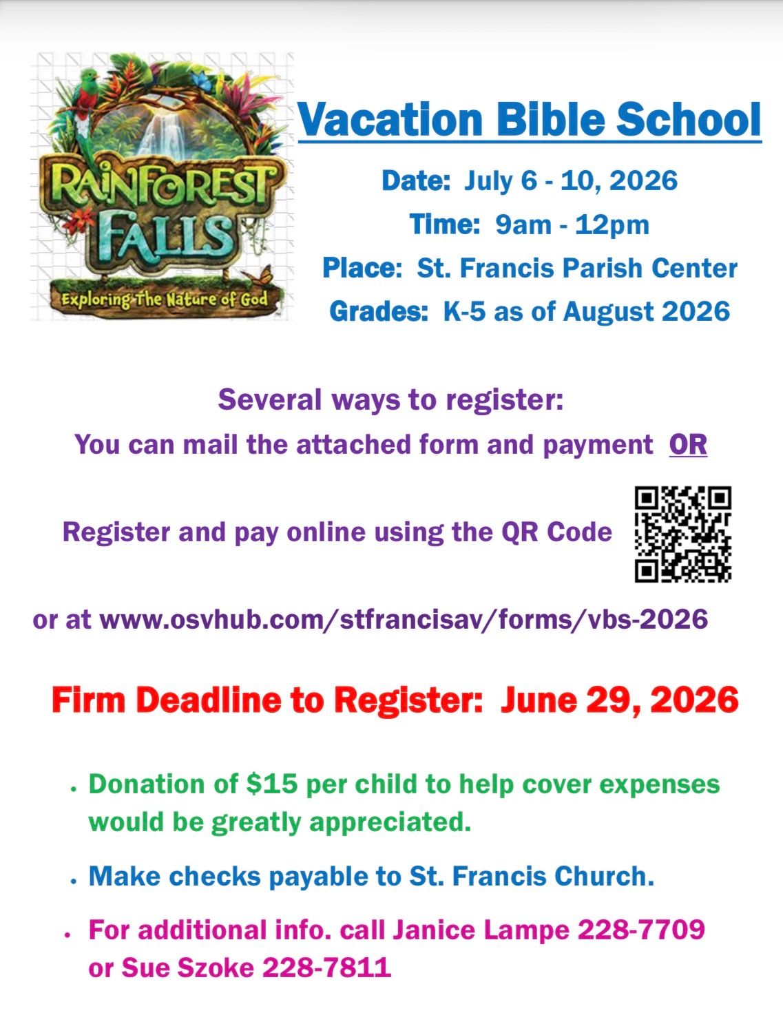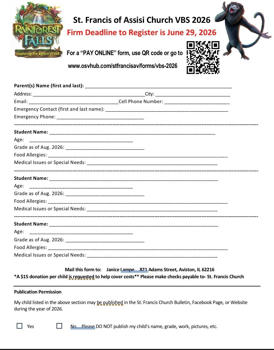 To use the “pay online” option, scan the QR code in the images below or go to this direct link: www.osvhub.com/stfrancisav/forms/vbs-2026.